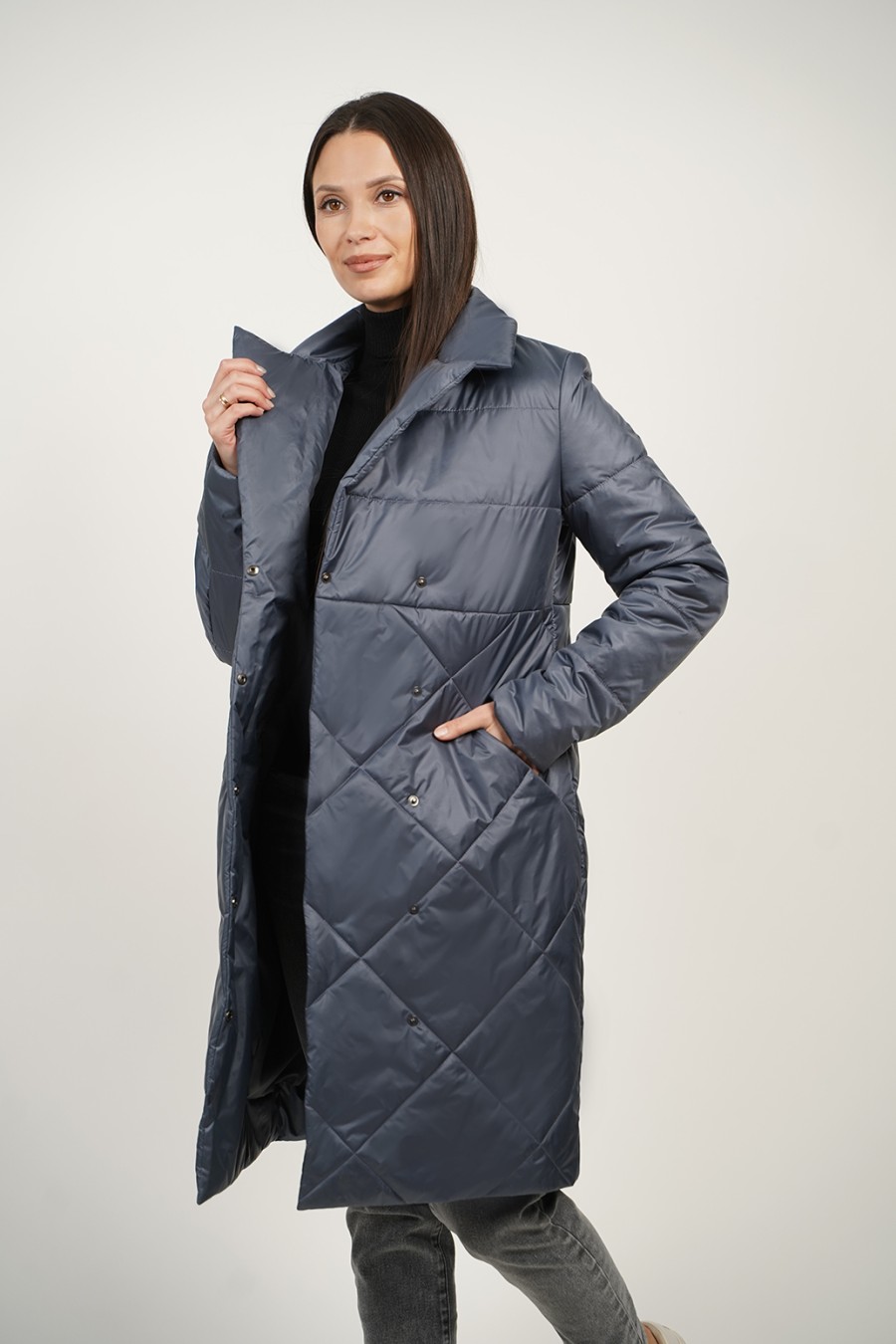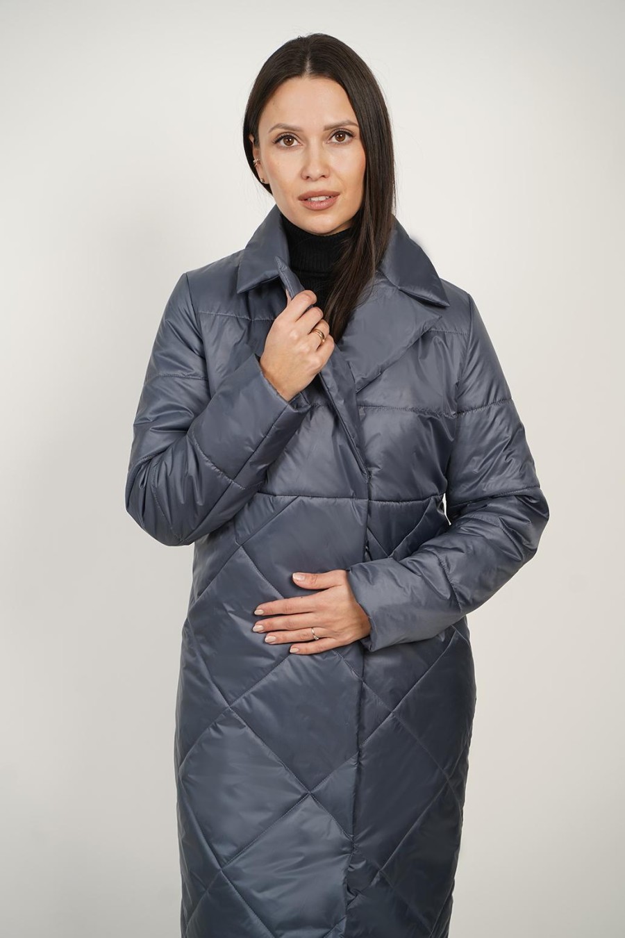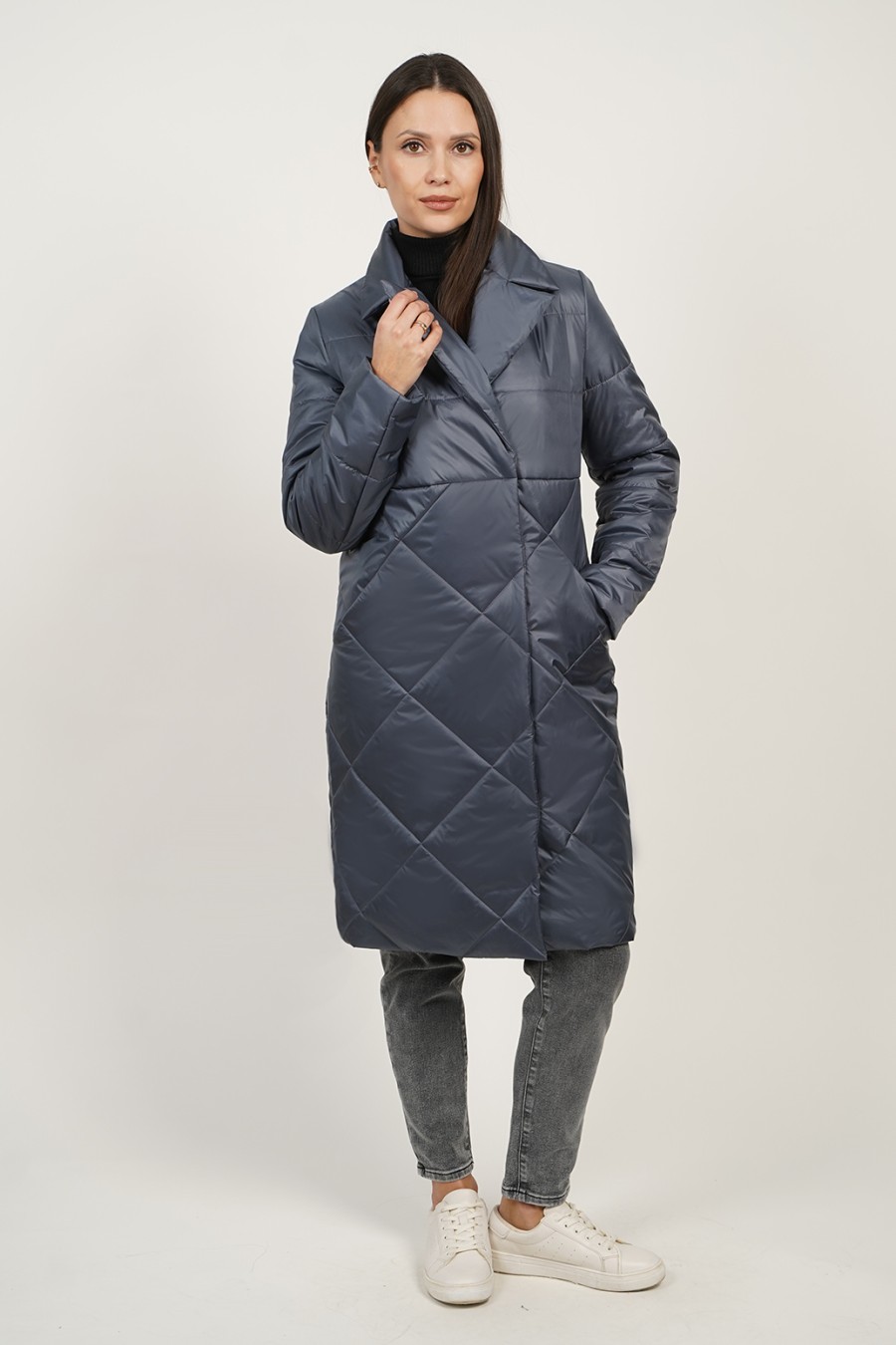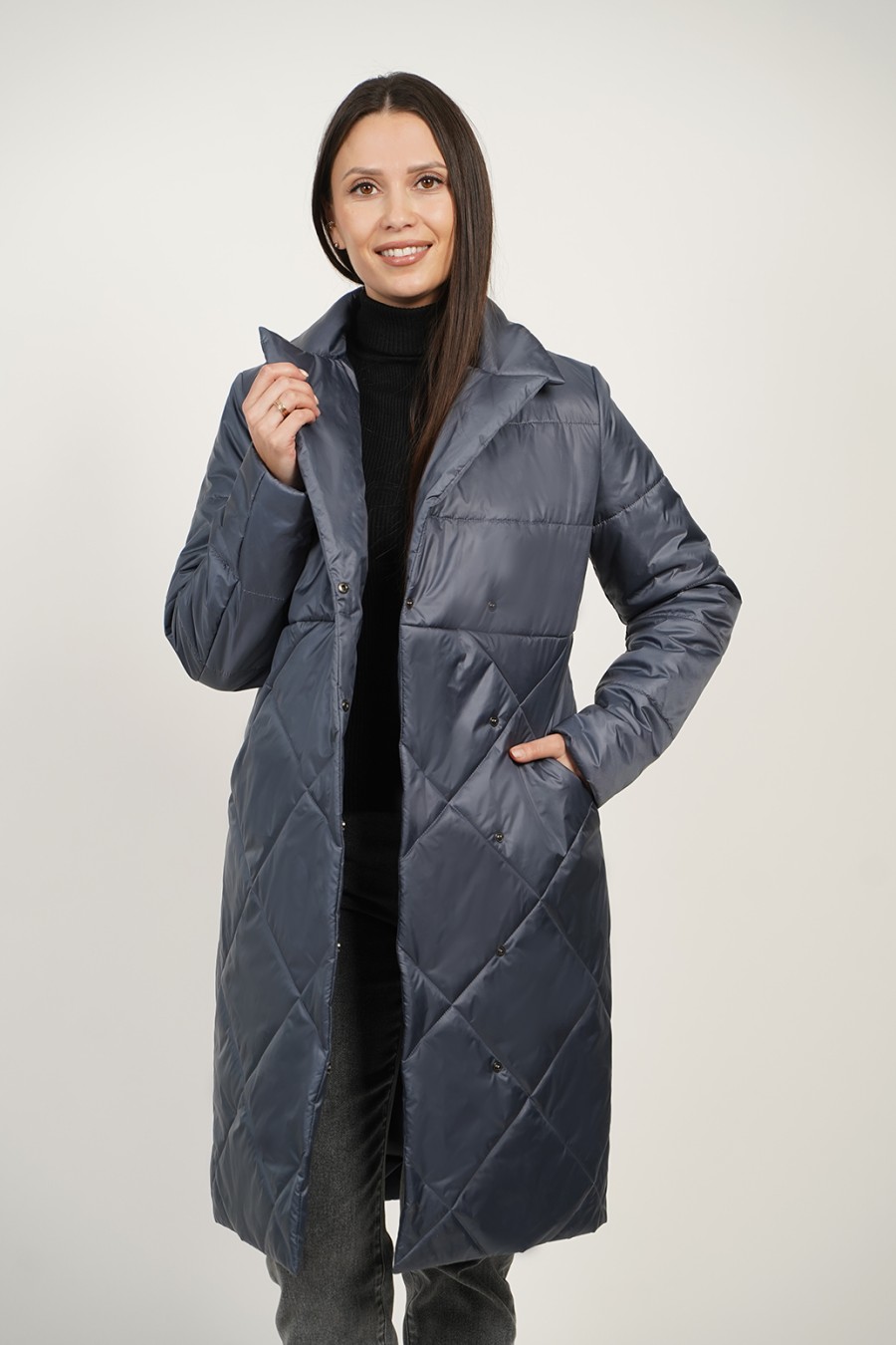 Это женское демисезонное пальто идеально подходит для осенних и весенних прогулок. Удлиненное стеганое изделие выполнено из качественного синтепона, что обеспечивает отличную теплоизоляцию и комфорт в прохладную погоду. Длинная модель до колен защищает от ветра и холода, а стильная стежка ромбами придаёт элегантный вид. Шалевый воротник добавляет завершающий акцент, обеспечивая дополнительное утепление и уют. Пальто также оснащено карманами в шве, что делает его не только стильным, но и практичным. С таким изделием вы сможете легко создать гармоничный образ для любого случая, оставаясь при этом в комфортной теплой одежде.