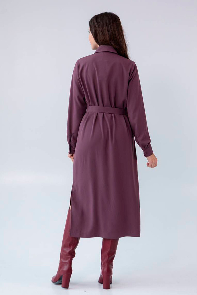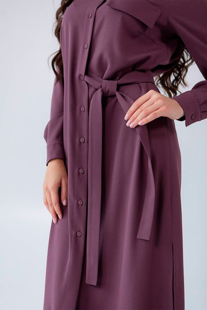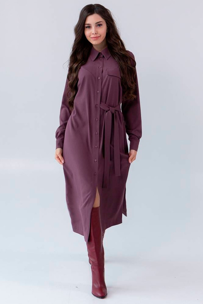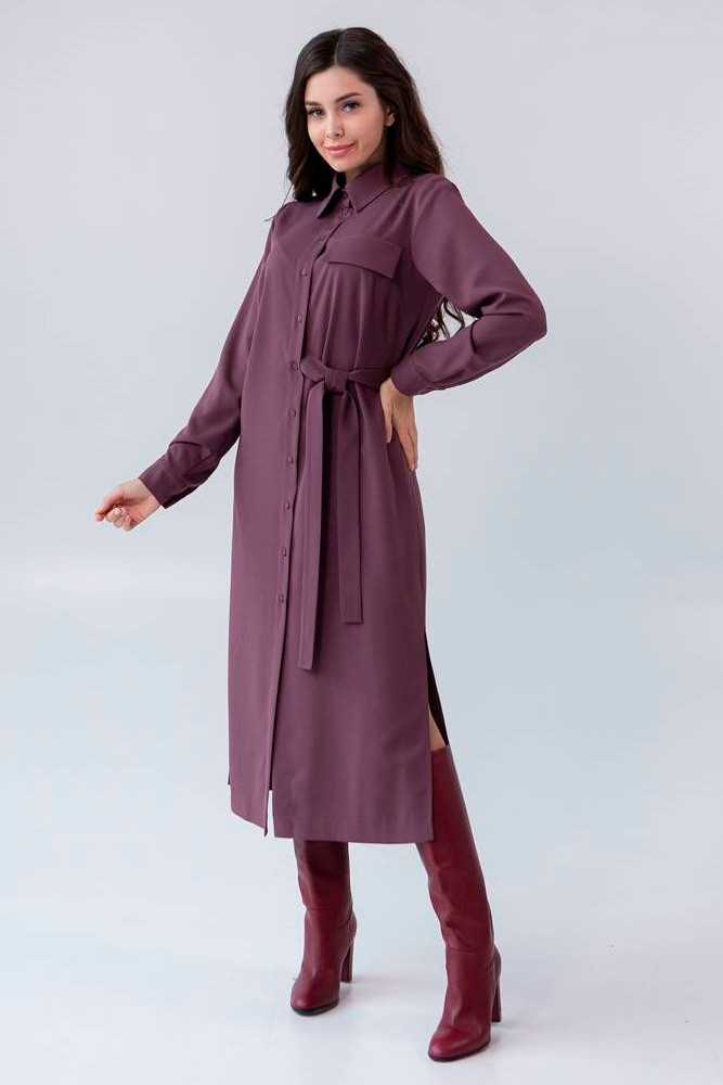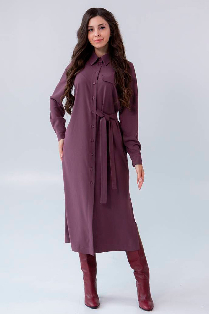 Платье полуприлегающего силуэта. Изюминкой является пояс, который проходит внутри платья с одной стороны, создавая объем по переду. Разрезы по низу обеспечат комфорт движения.