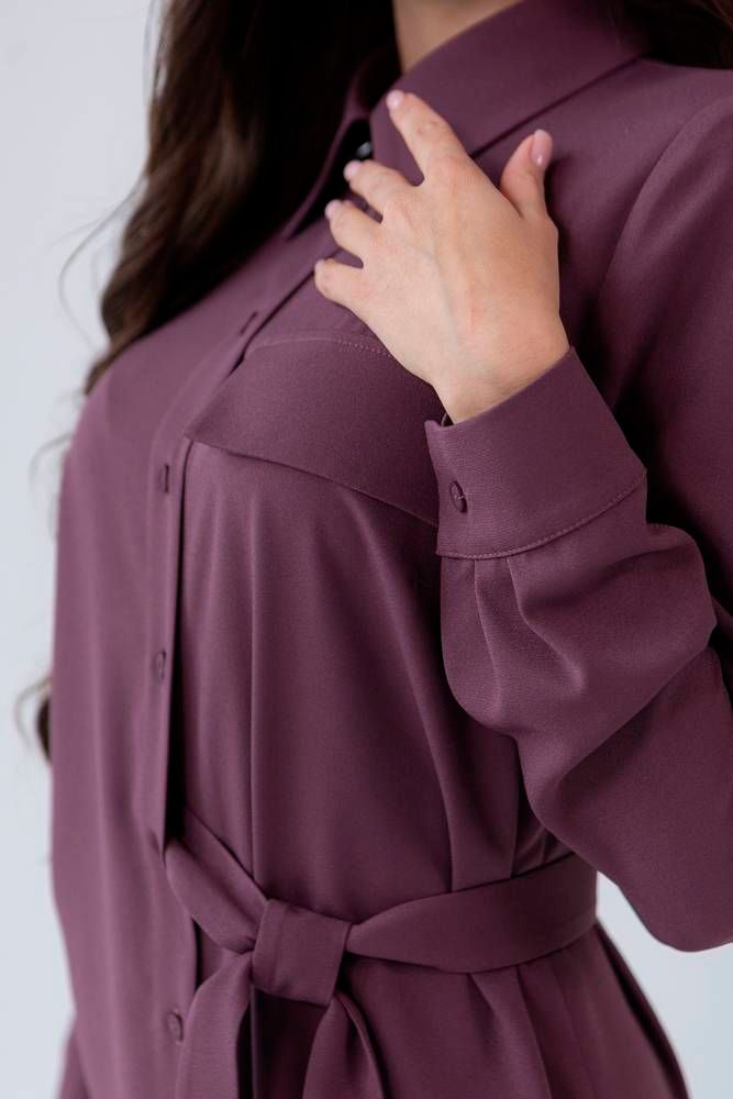 Платье полуприлегающего силуэта. Изюминкой является пояс, который проходит внутри платья с одной стороны, создавая объем по переду.