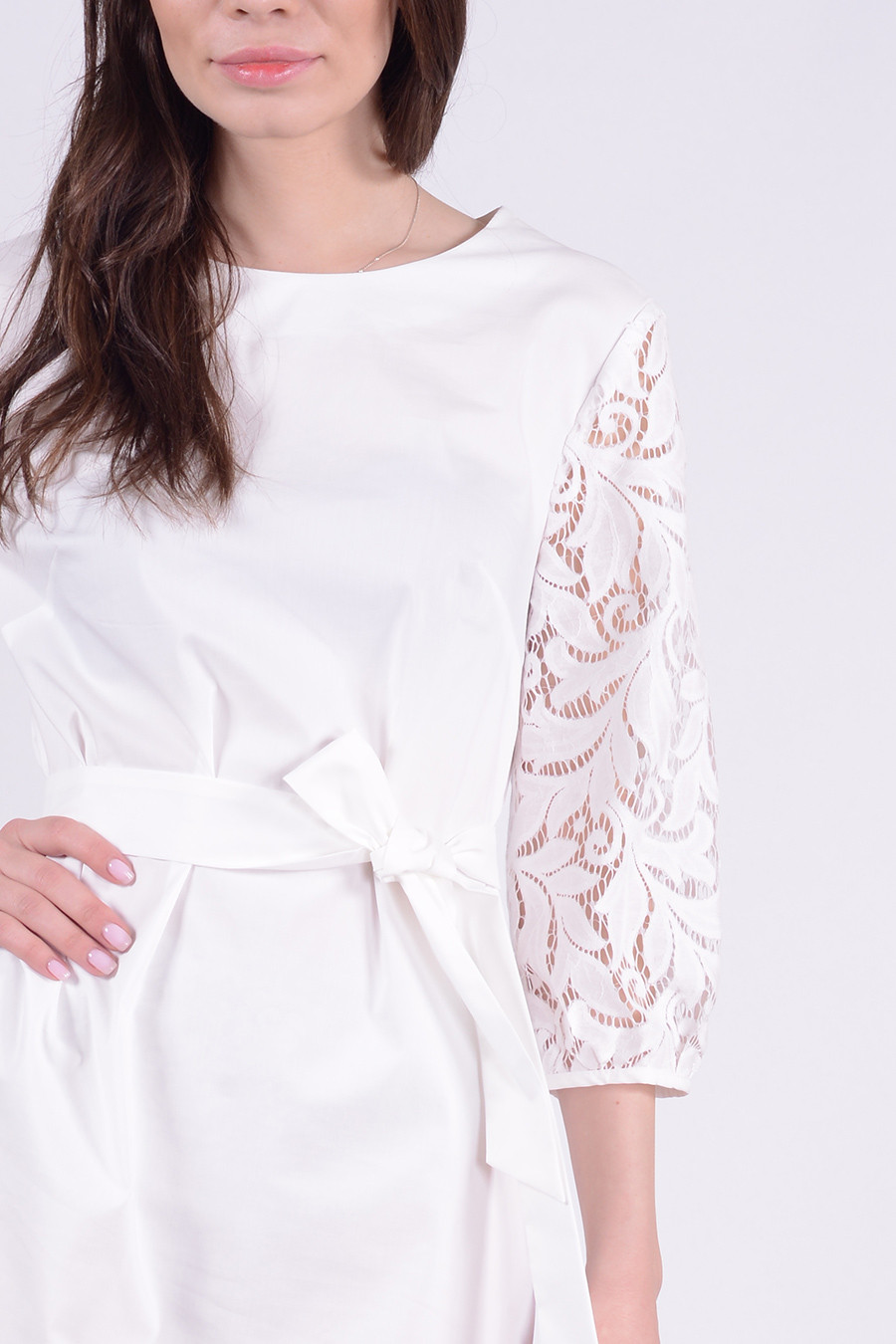 Платье с кружевной отделкой рукавов, и на плечах по спинке. Прямого кроя, с поясом. Фигурный низ. Платье "и в пир и в мир" позволяет носить его как со спортивной обувью, так и с элегантной.