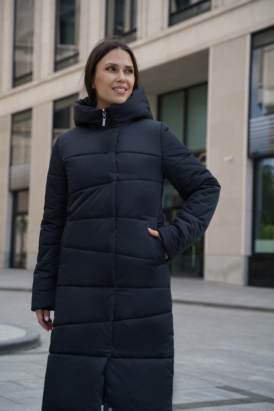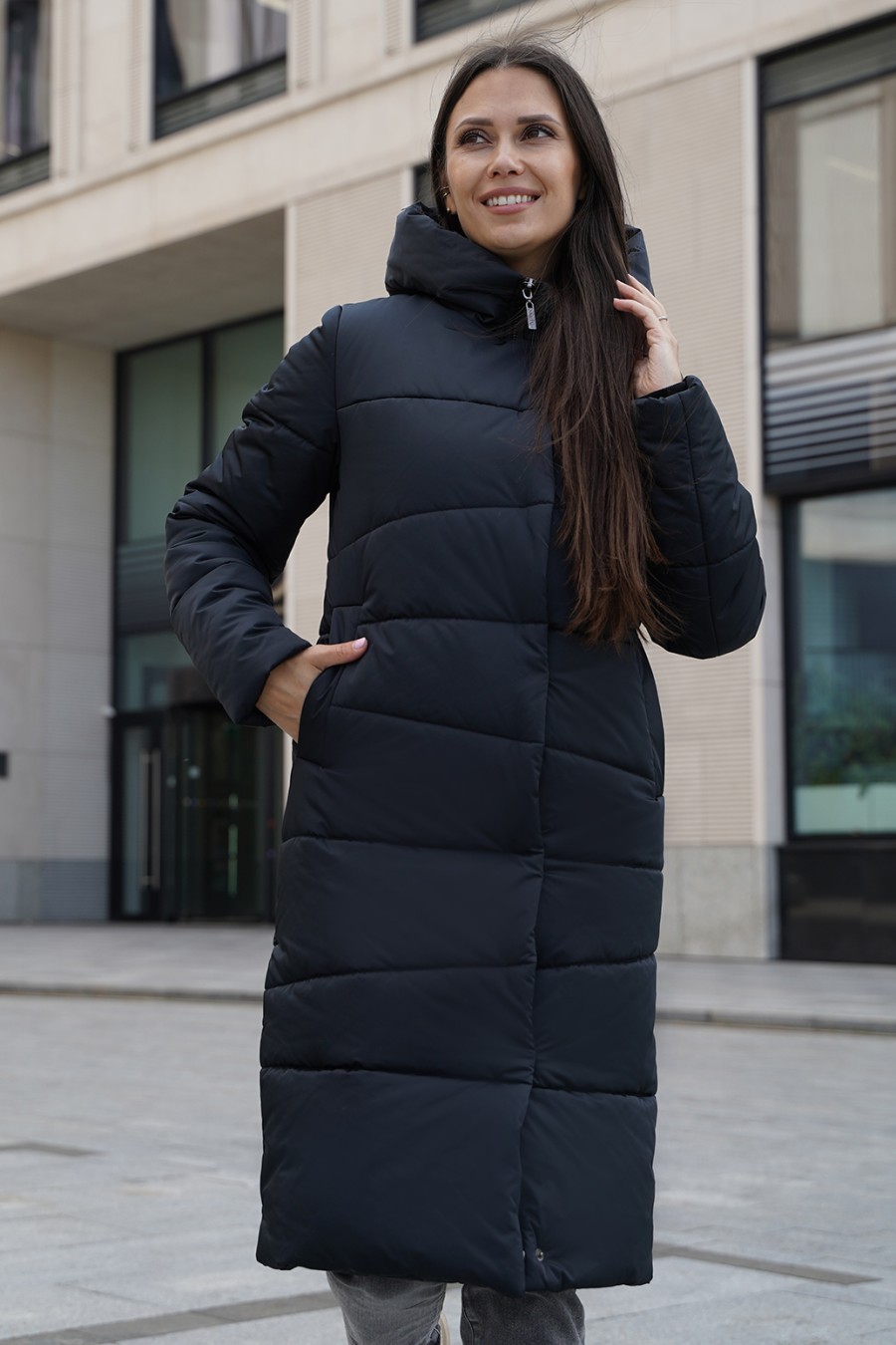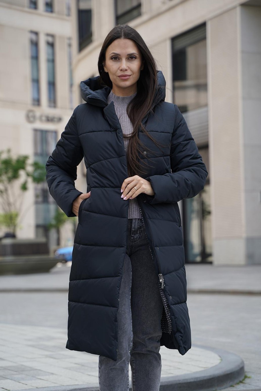 Зимнее пальто, создающего впечатление роскоши и изящества. Плотная ткань с трапециевидной стежкой придает изделию уникальный и структурированный внешний вид, а утеплитель из синтепона обеспечит тепло даже в самые морозные дни. Цельнокроенная планка с потайными кнопками и молнией с тракторным звеном выглядят аккуратно и современно, подчеркивая стиль и качество. Карманы-листочки добавляют нотки классики и удобства. Это пальто — словно уютное зимнее облако, защищающий и радующий глаз.