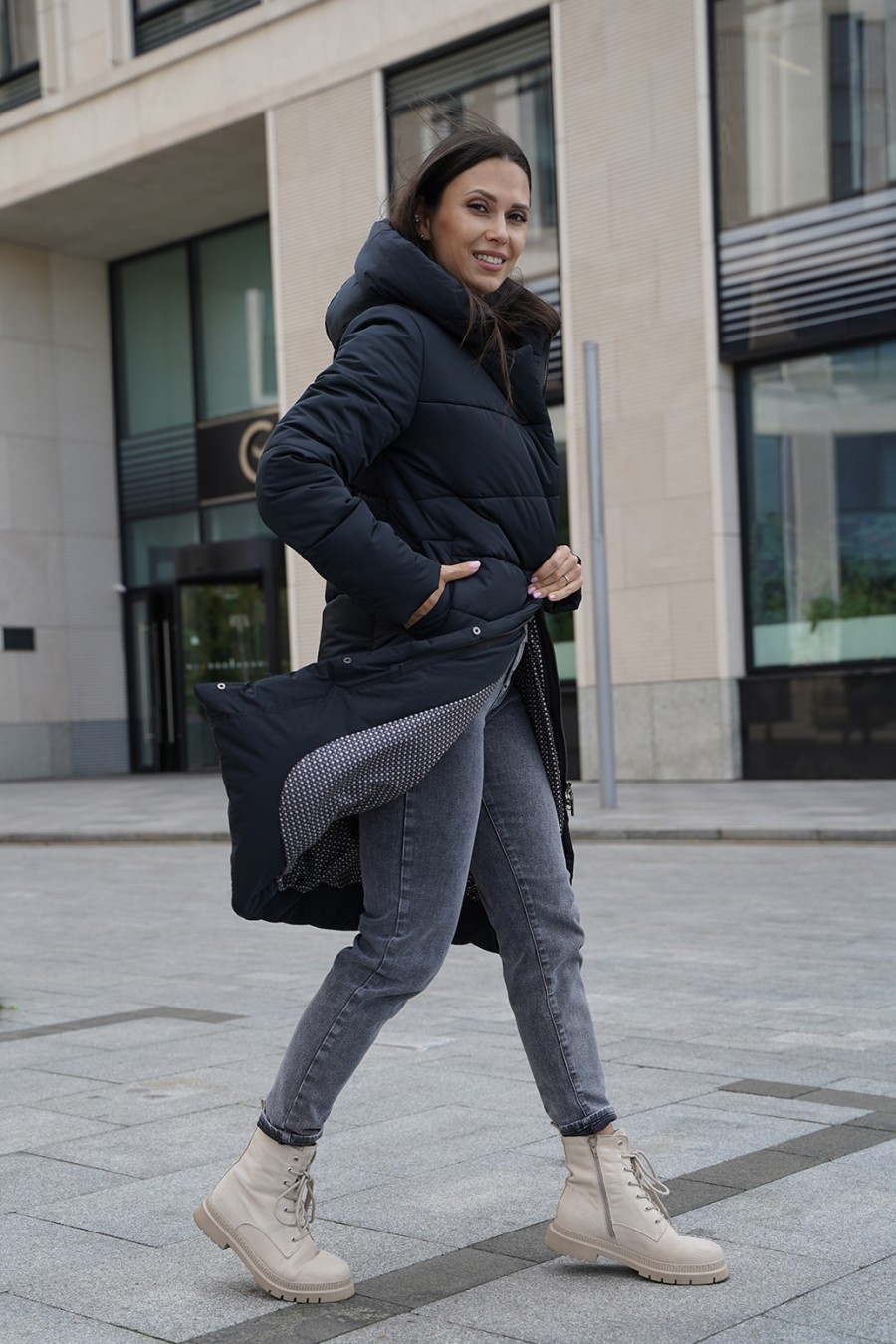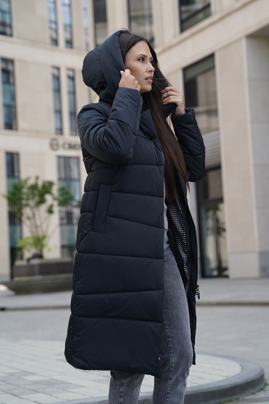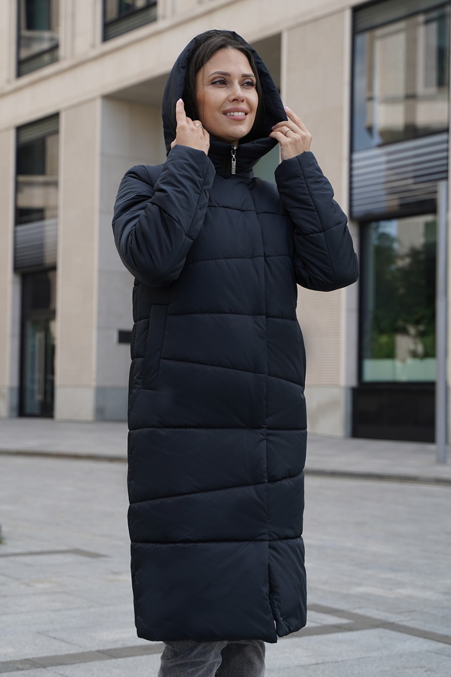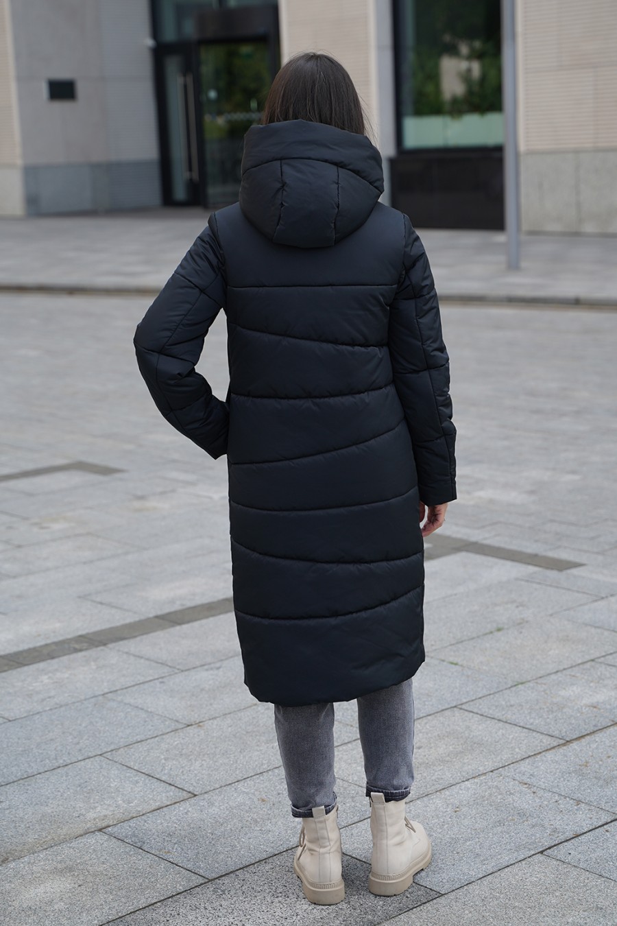 Зимнее пальто, создающего впечатление роскоши и изящества. Плотная ткань с трапециевидной стежкой придает изделию уникальный и структурированный внешний вид, а утеплитель из синтепона обеспечит тепло даже в самые морозные дни. Цельнокроенная планка с потайными кнопками и молнией с тракторным звеном выглядят аккуратно и современно, подчеркивая стиль и качество. Карманы-листочки добавляют нотки классики и удобства. Это пальто — словно уютное зимнее облако, защищающий и радующий глаз.